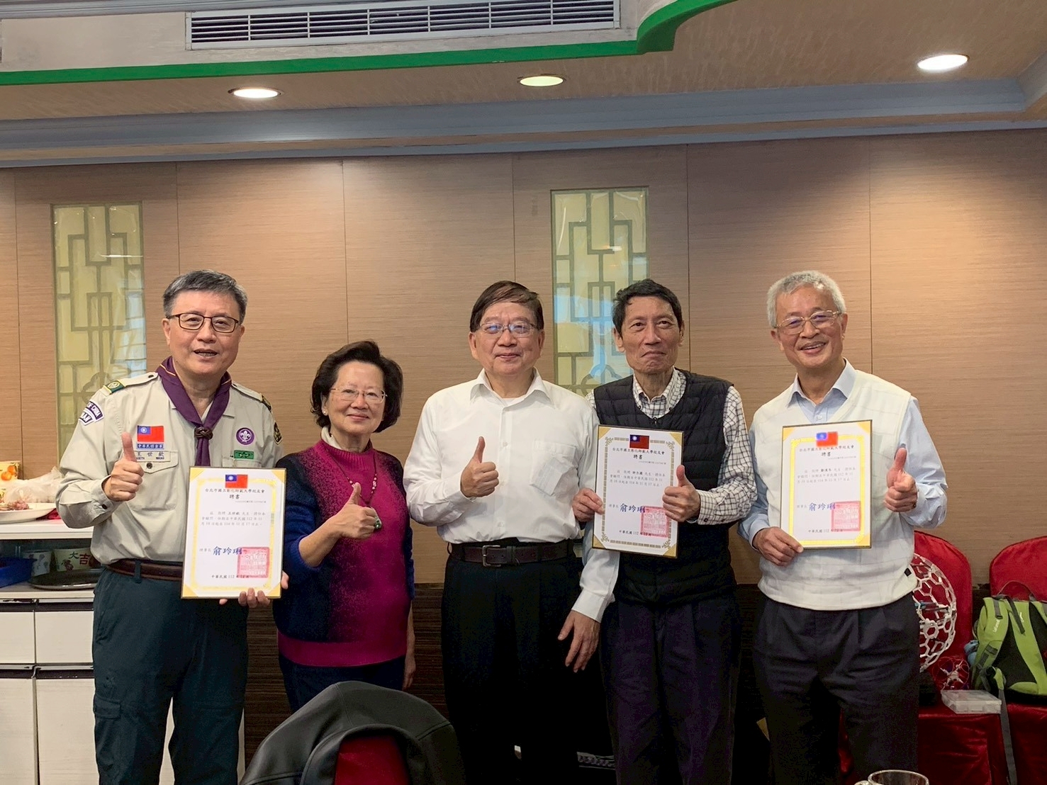 台北市校友會王世欽榮譽理事長(左1)、俞玲琍榮譽理事長(左2)、許立國顧問(右2)、鄭溪冬顧問(右1)